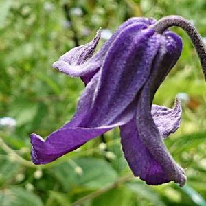 今日のパトロール スマホ📱 ポートレート撮影 本日最後 ニチニチソウ ビンカと共に お迎えした クレマチス ロウグチ💜 一季咲き みたいですが ベル型🔔愛らしい🔔🔔 夜中は 眠ります😴