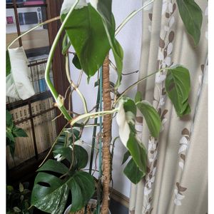 リビング窓際に置いている 「斑入りモンステラ」12枚目🌿 💚🤍 我が家に迎えて丁度1年です😊 前の葉に続いて 今回もまっ白? 光の加減で ちょっぴり薄緑の部分があるかも😆 今回は少し 切れ目が入ってる👀 嬉しい✨💓