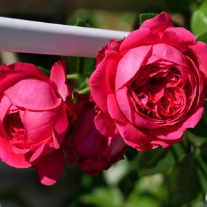 ルージュピエールドロンサールさんです。 フェンス仕立てですがまだまだツルが短いのでフェンスの下の方で咲いてます。昨秋一本だけ長いシュートを出したのでフェンスに固定しました。この花の真上で咲いています。左側はクレマチスがグングン伸びてます。