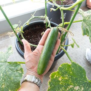 ベランダの行灯仕立てキュウリ。やっと一本目の収穫です。けっこう、べと病が出て苦戦しています(笑)