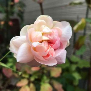 小さなヘリテージが咲いているのを見つけました🌹廃盤のイングリッシュローズで、良く咲きすぐ散るのですが、この寒さで長持ちしています😊後ろはカシワバアジサイ紅葉です。