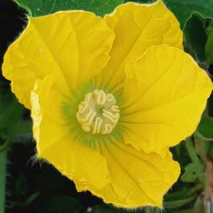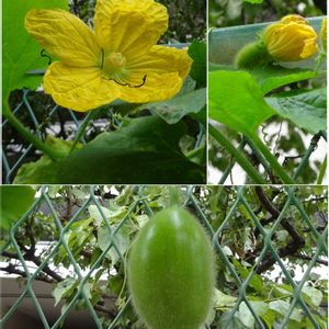 おはようございます 🏷️日曜日はビタミンカラーの日 に参加します トウガン(冬瓜) ウリ科トウガン属 雌雄異株 左上 雄花 9月27日 右上 雌花 10月3日 下段 若い実 9月4日 フェンスに若い実をミッケ。(花は無し) 久しくぶら下がっていたが、 突然消失 その後大きな花(5cm以上)が咲き 落花 その後、雌花を発見 残念ながら萎んでいた。 毛深さや葉っぱの形状から トウガンと同定しましたが、 違っていたらすみません メモ 果実は卵状長楕円形~楕円形~球形、長さ(20~)50~60(~200)㎝、幅10~25㎝、暗緑色~斑(ふ)入りの淡緑色又は白粉状、未熟なときは剛毛があり、熟すと剛毛が薄く又はほぼ無毛になり、チョーク白色に被われ、ろう状の層は簡単に落ちる 三河の植物観察
