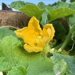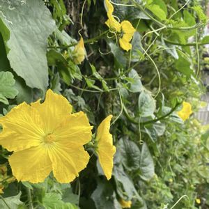 冬瓜 散歩中に遠くから、高く広い範囲で咲いている黄色い花を見つけ、思わずコースから外れて近づいみたら、まぁ見事に咲いていて どうやらお店の裏の壁に2階の方まで伸びている… お店の方が、冬瓜とゴーヤの花が混在して咲いている と教えてくれました😃 大きな葉をかき分け冬瓜を採って持たせてくれました🙇♀️