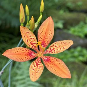 ヒオウギ(檜扇) 日当たりの良い場所にオレンジの花がSpotlightを浴びているような… 1日花ですが、次々と咲きます。 6月の終わりに来た時は蕾でした。暑かったんですが、この花を見に行ってきました🧡🧡💕 葉っぱが重なってる姿が扇が開いた形に似ています🌿🌿🌿 ①②③ 花期 8月から9月 2025.8.3