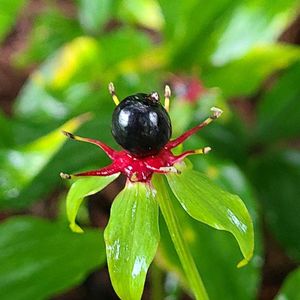 早くも色づいてました。 とても綺麗な色になっていました♪♪ ツクバネソウ(衝羽根草) シュロソウ科 ツクバネソウ属 多年草 北海道、本州、四国、九州に分布。 山地の林内、林縁に生育。 茎の高さは15~40㎝。 葉は4個が輪生。長楕円形で先が尖る。縁は全縁。 花は淡黄緑色、茎の先端に1個上向きにつける。 外花被片は披針形で、長さ10~20㎜、緑色の萼状。内花被片はない。 雄蕊は8個、花糸は長い。 葯は線形で、同属のクルマバツクバネソウと違い、葯隔は葯から突出しない。花柱は4個に分枝する。 果実は液果で1㎝ほど。羽根突きの羽子に似た実が黒紫色になる。 花期5~8月 福島県中通り 南部 7月27日撮影 3~5枚目は5月4日撮影 5枚目は5枚輪生でした。
