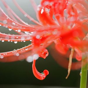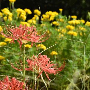 【彼岸花:曼珠沙華シリーズ③編】 ☆彼岸花:曼珠沙華:Red spider lily//cluster-amaryllis ♡この写真画像は、近所の小さな山の入り口の山道の林の中で、ひっそりとこの花だけが咲いていたものデス)^o^( どうぞ9月19日・21日の彼岸花シリーズ①・②をもご参照くださいマセ( ◠‿◠ ) 【ヒガンバナ::彼岸花の豆知識】 日本では秋の花として親しまれるヒガンバナ:彼岸花デスが、別名、リコリスや曼珠沙華とも呼ばれ、日本特有の「彼岸」の時期に咲く花として知られています。 映画や歌のタイトルにも使われたことから、「赤い花」として印象に残っている方も多いのではないでしょうか? 彼岸花(曼珠沙華)とは? 英語名や別名の読み方、学名や原産国は? 彼岸花:ヒガンバナ 学名 : Lycoris Radiata 英名 : Spider lily/ cluster-amaryllis etc., 原産地: 日本、中国 開花期: 7~10月 花の色: 赤、白、ピンク、黄、クリームなど 別名:彼岸花の別名はたくさんあります。 曼珠沙華(まんじゅしゃげ/かんじゅしゃか)、死人花、地獄花、幽霊花、剃刀花、狐花、捨子花、毒花、痺れ花、天蓋花、狐の松明、葉見ず花見ず、雷花、レッドスパイダーリリー、ハリケーンリリー、マジックリリーなどなど ☆ 彼岸花の英語名: ・cluster‐amaryllis/ spider lily clusterには、房、束という意味があります。 【例】a cluster of grapes 「一房のぶどう」 また彼岸花は、その姿がクモの形から、赤い彼岸花は"red spider lily"白い彼岸花は"white spider lily"と言われることもあります。 彼岸花とはヒガンバナ科・ヒガンバナ属(リコリス属)に分類される球根植物です。 日本や中国に広く自生し、秋の彼岸の期間(秋分の日を入れた前後3日間)だけに花を咲かせることに由来して名付けられました。 9月になると赤や白、ピンクなど花を咲かせるのが特徴です。 彼岸花:曼珠沙華は「まず花が咲き、後から葉っぱが伸びる」という通常の草花とは逆の生態をもっています。 その葉と花を一緒に見ることがない性質から「葉見ず花見ず」と呼ばれ、昔の人は恐れをなして、死人花(しびとばな)や地獄花(じごくばな)などと呼ぶこともありました。 確かに彼岸花には葉っぱのイメージがないですね。 彼岸花の葉は、花が咲き終わった4〜5月頃に、地際から多数発生します。 濃い緑色で光沢のある細い葉が特徴です。 ☆彼岸花(曼珠沙華)の開花時期や見頃の季節は? 彼岸花の見頃の時期は、9月下旬あたりです。 自生している原種は彼岸である秋分の日前後に花を咲かせますが、品種改良によって最近では夏〜秋の間に見頃の時期を迎えるものもでてきました。 ♡ヒガンバナ:彼岸花:曼珠沙華の花言葉: 「あきらめ」「独立」 ☆色別の彼岸花(ヒガンバナ・曼珠沙華)の花言葉 ・白の彼岸花(ヒガンバナ・曼珠沙華)の花言葉は「また会う日を楽しみに」 ・赤の彼岸花(ヒガンバナ・曼珠沙華)の花言葉は「情熱」 ・黄の彼岸花(ヒガンバナ・曼珠沙華)の花言葉は「深い思いやりの心」 *雨後の彼岸花 乾燥状態が続いた後に大雨が振ると、一斉に花が咲くという現象があります。 これが「雨後の彼岸花」とも呼ばれる由縁です。 もし彼岸花を見に出かけるなら、雨が止んだ後をお勧めします。 とても彩りが美しく輝いて綺麗で、写真撮影がより楽しめますょ⁈ 📝彼岸花:曼珠沙華の投稿は、下記の【キーワード】選択で【彼岸花:曼珠沙華シリーズ 和堂】をタップすると、全てがご覧頂けます。 ♡どうぞ花と蝶をお楽しみ頂けましたなら幸いデス🙏 by Kazyan’s Green Shot Artistic: The Red Helen 2020/Sep 23/past am 09:30' 📱shooting 2020/Sep24/past am 04:50’ upload