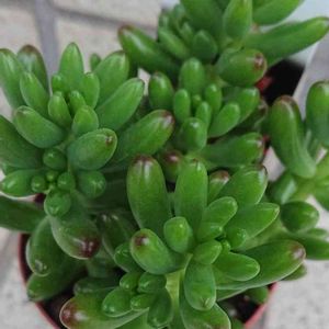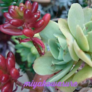 グリーンネックレスとセダム よく風が吹いて、雨が当たりにくいので、棚の上段に移してからすごく色づきがいい。