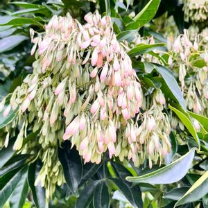 シマトリネコ(モクセイ科) 「シマ」は「島」の意味で暖かい島が原産地だそうです♪ 小さなふわふわの花、繊細な枝、艶のある柔らかな葉♡ 近所の公園の脇道に立っています🌳 雄木と雌木があり、花が咲くのは雌木のみらしいです♬