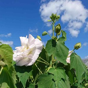 おはようございます😄… 庭の酔芙蓉さんです😉… 青空の中 徐々に咲き始めました… (毛虫🐛に葉っぱ🌿を いっぱい食べられましたが退治をずっと頑張ってきました💪) 花期が10月くらいまで あるので これからいっぱい楽しませてくれると思います🤗💕…