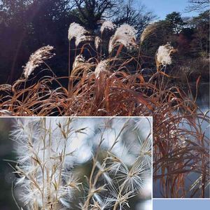 🏷木曜モフモフ 自然教育園池のススキの穂、真っ白に芒(ノギ)が輝いています✨✨ ススキの別名カヤ 屋根をふく材料とするカヤはススキやヨシ等の草が枯れたものです。 イネ科