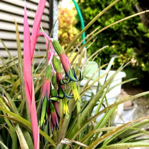 ヨウラクツツアナナス(瓔珞筒アナナス) 学名 Billbergia nutans (ビルベルギア・ヌタンス) 英名 friendship plant queen’s-tears(女王の涙) ブロメリア科 ビルベルギア属 Billbergiaは植物学者の名 nutansは「頷く」の意味 和名の瓔珞(ようらく)とは〜装身具または仏堂・仏壇の荘厳具のひとつ。 原産国 南米(ブラジル南部、ウルグアイ、パラグアイ、 アルゼンチン北部) 多年草 常緑 着生植物 草丈 20cm~30cm 日本には昭和初期! 特徴的なきれいな色の花💕エキゾチック😘 葉には細かな鋸歯あり! 庭植えの場合、ほったらかしで良い💕 適地 日なた 半日影 肥料 不要 水やり 暖かい時期は、タンクブロメリアなので、筒の中心に水が溜まっていれば良い。冬は与えない。 耐寒性 耐寒温度は-3℃程度でそこそこ強い 耐暑性 強い 仕事帰りに見つけた地植え! お手入れ全くしてないようなワサワサの葉の間から、いくつも咲いてました😍 葉っぱが邪魔な上、雨降ってるし、風でユラユラするし、なかなか上手く撮れなかった😅