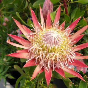 キングプロテア (ヤマモガシ科プロテア属) 別名 プロテア・キナロイデス 原産地 南アフリカ 初夏から夏にかけて大きなお花を咲かせエキゾチックな雰囲気をかもし出し葉は硬く革のような質感が特徴のお花 プロテアの花名の由来はギリシャ神話に登場する姿を自由に変えられる海神「プロテウス」から由来しています キングプロテアは南アフリカ共和国の「国花」になっており 昔は王様しか目にできないお花だったとか… ドライフラワーにも使用されます 花持ちは1~2週間ほど 花言葉 自由自在 華やかな期待 王者の風格 (キングプロテアのみ)