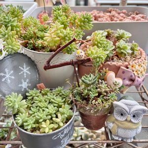 こんばんは✨✨ 🏷️フクロウ祭り フクロータンいるよー🦉 増やし中の花団錦♡ みどりんになってるけど元気🥰 カットして増やしてます♪ pic1と2は花芽をカットした後だけど、pic3、4はお花が咲いてて可愛い♡ セダムのお花ですねー🌼 サニコさんの寄せ植え💕 アイシングクッキーのピックがお気に入り♡♡♡ ピンクの韓国鉢のシュガーベイビーもみどりん🤣