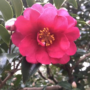 夕暮れ時、赤色の鮮やかなハルサザンカ「千代鶴」をパチリ!📸🌺🌿😊😄🌇✌️