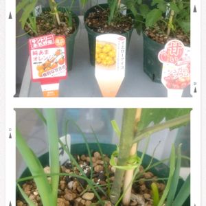 おはようございます ベランダ菜園 ミニトマト3種類 (オレンジ、イエロー、レッド) 4号ロング鉢に仮植え コンパニオンプランツ (ネギとニラ)