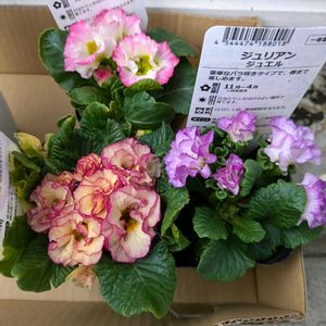 今日のお花『プリムラ』🩷🤍💜 ①お正月🎍の寄せ植えにプリムラジュリアン2種を植えました。 白地に縁がピンクのフリルが可愛い『シルキー』🤍🩷と、半八重品種『冬の祝福』も明るいピンク🩷に白🤍の絞り模様になってて、いい感じ💓💓 ②今年もまたお迎えしてしまったバラ咲き🌹のジュリアン『マスカットのジュレ』💚…爽やかなお色です💕 ③ジュリアン『ジュエル』もバラ咲き🌹…白🤍からうす紫💜に変わっていくのかな? ④これも『ジュエル』…白🤍が眩しいくらい😊✨ ⑤これも去年に引き続きお迎えしたバラ咲きジュリアン🌹『プリンアラモード』🍮…食べたくなるようなお名前❣️ 暮れにお迎えしてまだ植え付けてません😅💦 暮れから昨日まで孫達が来ていたので水やりだけで精一杯でした💦 明日には植え付けようっと😊💕
