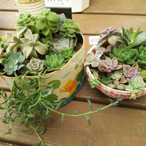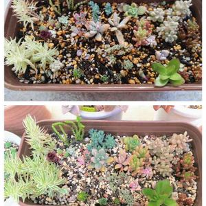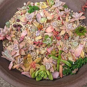 帰省先で手に入れた多肉たち🌱 狩りすぎて置く場所が無いので ぜーんぶまとめてぶっ込み丼! 結果…計画生とセンスの無さが浮き彫りに!笑 でもぷっくりした多肉たちを眺めてるだけで幸せ〜💓
