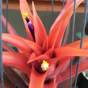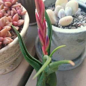 1月に購入したダイソーのエアプランツのお花が咲きました! 葉っぱは赤っぽいピンクで、花は紫。めしべの花粉が黄色で極彩色。 とても綺麗。 エビ反りポーズです。🦐