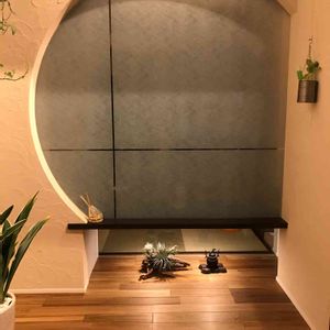 玄関入ってすぐに、流木&エアプランツを。 個性豊かな4人家族の我が家がモチーフです。(笑)