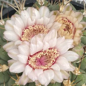 こんばんは😆 南に月が沈んでいく時期になりましてこの時間に綺麗な月が見えます🌙 心地よい風が吹いていて最高です☺️ ギムノカリキウム ゼガラエ❣️ 去年よりもしっかり咲いてくれました🙌🙌🩷 相変わらずクシュッとかたまって咲いていますが白い花弁にピンクの蕊がとても綺麗です 夏に一部日焼けで真っ白になりましたが元気そうでなにより🥰🥰