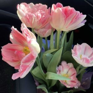 久しぶりに伯父夫婦に会うので、お土産に鉢植えチューリップを選びました🌷 車内にお花が有るだけでhappyです♪