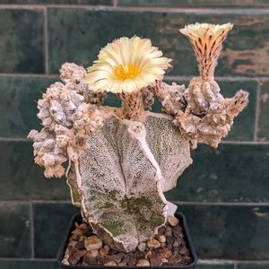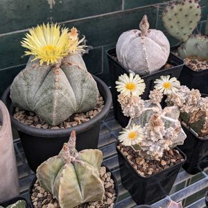 ☀☀☀☀🥵 カゴグループ🌵30輪目🌼 2枚目、月世界、種がたくさんできてる様だ😔放置 3枚目、ランポー玉🌼🌼 4枚目、室外機上の🌵も🌼🌼 5枚目、伸びすぎのフェルニアゼブリナをバラバラに。乾燥中