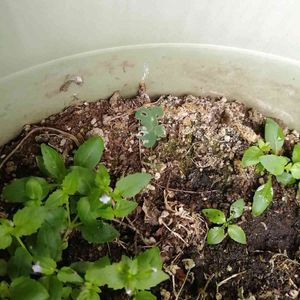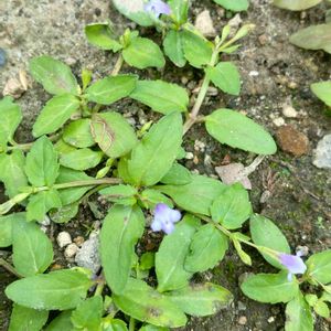 庭にたくさん出てきました🌿 花は、トキワハゼ、出始めの葉は、トレニアに似ています なんでしょうか?🤔教えてください🙏 ウリクサと教えていただきました 5ミリほどの小さな花です💜 大きさ•••ムラサキサギゴケ>トキワハゼ>ウリクサ の順ですね😅 💜