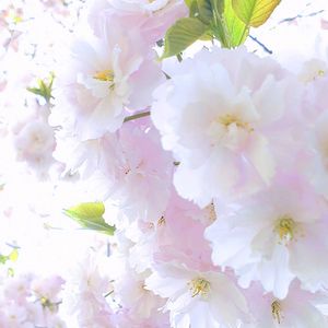 御苑の八重桜の代表格「一葉」 普賢象 松月と並んで ほんとに素敵ですねぇ・:*:・(*˘︶˘*).。*・:*:・ 江戸時代以前からある栽培品種で荒川堤で栽培されていたサトザクラの一つ。樹高は高木 樹形は広卵状。樹皮が縦に裂ける特徴がある。八重咲きで大きい物では5cm以上の大輪の花を咲かせ 花弁の色は淡紅色。花弁の内側が白いため開花が進むと白色に見えるようになる。東京の花期は4月中旬。花の中心部の1本 (稀に2本)の雌しべは正常な柱頭と花柱ではなく細い葉のように葉化しておりイチヨウ(一葉)の名の由来となっている。このように葉化した雌しべを持つ似た品種にフゲンゾウとショウゲツがあるが いずれも生殖能力を失っており結実できないため接ぎ木や挿し木でないと繁殖ができない。