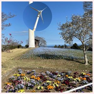 いわき市フラワーセンターにて♬ ネモフィラはもう少しで満開💙 🏷️ビオラパンジー祭り♪たくさん花壇に♬ 満開の🌸の向こうに海も見えてステキなところです😍