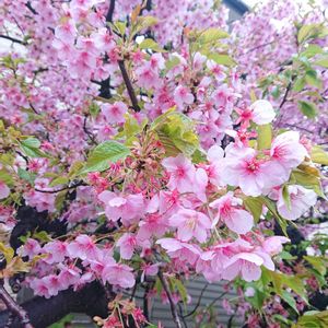 オカメザクラ(阿亀桜) バラ科サクラ属 落葉小低木 イギリスの園芸家 コリンウッド.イングラム氏が カンヒザクラとマメザクラを交配して作出した桜です🌸💓🌸💓🌸 花は寒緋桜に似て濃いピンク色 一重で下向き、あまり開かず咲きます 豆桜に似て樹高が低く庭や街中の街路樹としても植えられているそうです 早咲きでソメイヨシノより2週間くらい早く咲きます🌸💓🌸😊🎶