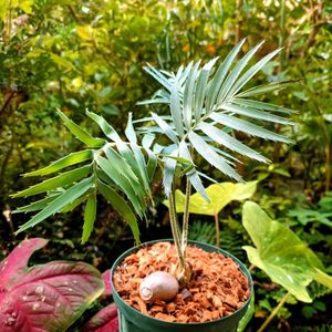■Copernicia alba ・コペルニキア アルバ こちらも鉢増し完了。すっかり秋ですね。 最高気温22℃、最低気温14℃ 〈特徴〉 ■概要 パラグアイ、ボリビア、アルゼンチン原産のヤシ科の植物で、熱帯および亜熱帯地域に適しています。成長は遅いです。 ■形態 ・樹高・樹形: 最大で高さ15m~25mに達する、単幹のヤシです。幹の直径は約25〜40cm。若い木は枯れた葉の基部が残ることがありますが、成熟すると滑らかな灰色の幹になります。 ・葉: 葉は掌状(扇形)で、やや硬く、色は緑色から銀色がかった緑色、または薄い青緑色をしています。葉柄には鋭いトゲがあるので、取り扱いには注意が必要です。葉の裏側などから**ワックス(ロウ)**が採取され、化粧品や自動車ワックスなどに利用されることがあります。 ・花・実: 春に目立たない白または茶色の花を咲かせ、受粉後に丸い果実をつけ、熟すと黒くなります。 ■耐寒性(コペルニキア属で最も耐寒性が高い種) 非常に耐寒性が強いヤシの一つとされています。 通常、-4℃〜-7℃程度の低温に耐えることができます。 軽い霜程度であれば耐えられますが、継続的な氷点下の温度や強い霜に当たると葉が傷んだり、枯れることがあります。根が生きていれば春に再び芽を出す可能性もありますが、幼木は特に寒さに弱いため注意が必要です。 〈育て方〉 ■栽培環境 ・日当たり: 日当たりの良い場所を好みますが、半日陰でも育ちます。 ・土壌: 水はけが良く、肥沃な土壌が適しています。土壌のpHは幅広く適応しますが、水がたまるような場所は避けてください。 ・風: 強風で葉が傷みやすいので、風当たりの強い場所は避けるのが望ましいです。 ■水やり ・地植え: 一度定着すれば高い耐乾燥性を持ちますが、特に成長期や土壌が極度に乾燥しているときは水やりをすると成長が早くなります。 ・鉢植え: 土の表面が乾いたらたっぷりと水を与えます。特に夏場は乾燥しやすいため、毎日水やりが必要になる場合もあります。冬は水やりを控えめにし、乾燥気味に管理します。 ■肥料 適切な成長を促すために、ヤシ用の緩効性肥料を定期的に施すことが推奨されます(春と秋に2回など)。カリウム不足を防ぐために、ヤシ専用の肥料を用いると良いでしょう。 ■冬越し 比較的耐寒性がありますが、低温には注意が必要です。 温暖地では、軒下など霜の当たらない場所で管理することで屋外越冬が可能な地域もあります。 寒冷地では、鉢植えにして冬は室内の明るい場所に取り込むか、地植えの場合は霜よけやマルチングなどの厳重な防寒対策が必要です。 ■剪定 剪定は、主に完全に枯れた葉を取り除く程度で十分です。葉柄にトゲがあるので、作業時には十分な注意を払ってください。 ・・・・・ 3枚目 ・Dypsis sp. 'dark mealy bug' ディプシス ダークミーリーバグ 4.5枚目 ・Chamaedorea radicalis チャメドリア ラディカリス 10/22のpicがわかりにくかったので記録用に。