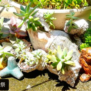 シーサー祭第2投稿。旦那の作った貝殻多肉寄せ植え。 あちこちに点在して、見映えしなかったの‼️集めてみたら、結構見映えするじゃん😁🦁🐚 50いいね👍いったら、褒めてあげようかな🎵✨ 皆さまのいいね👍次第です➰