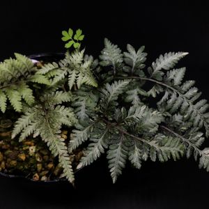 Athyrium niponicum f. metallicum ニシキシダ(白斑) イヌワラビの変種とされてるニシキシダの白斑入りです。 ニシキシダ自体も綺麗なシダなんですが、それの斑入りとなると最高に綺麗です(*´∀`) とりあえず山野草鉢でカッコよく植えこもう。