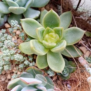 ジェニーンの中心が可愛いです( * ॑꒳ ॑*)🩷 他の多肉ちゃんの中心がこんな色してたら心配しちゃうけど、ジェニーンなら大丈夫なはず!!(´▽`;) '`'` pic②は元株 胴切り後、あまり成長を感じられません💦色もかなりのみどりん💚 元株の隣は葉挿しだったかな…🤔 pic③④は特に可愛い葉挿しちゃん💛💚 写真だとあまり可愛さが伝わらないけど、薄っすらファセットラインもあって中心がかなり可愛いんです(´,,•ω•,,)キュン🩷 でもこの子、全く情報ない💦 名前間違ってるのかな〜( ´ ` )💦