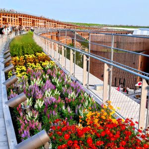 7月4日(金) 大阪・関西万博 これが大屋根リング お花が咲き乱れる壮大な木造建築 なんと壮大な建築物でしょう🎵 大屋根リングには エレベーター,エスカレーターで 昇り降りします。 ワタシは敷地のごく一部, 大屋根リングの4分の1以下 歩いただけらしい〜👀❗