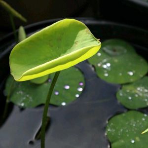立ち葉が上がりました♪立ち葉一番乗りは小型のハス「寿星桃」です。昨年も立ち葉がガンガン上がりましたが、その後の花芽が上がらず花を見ていません(笑) 肥料あげすぎだったのかな〜? (; ・`ω・´)