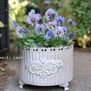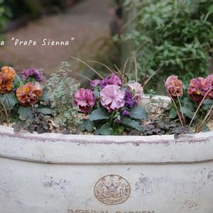 ふりふりひらひら… 大人可愛い暖色系のビオラ 北島園芸さんの ドレープシエナ ピンク〜オレンジ系の絶妙なグラデーションで揃えて3つお迎えしました 花色は、ピンクやオレンジ色なのに、決して派手ではなく、優雅で落ち着いた雰囲気のビオラです ミルク色の横長鉢に… 彩度を抑えた色合いのリーフを添えて寄せ植えしました (❁´ლ`❁)♪