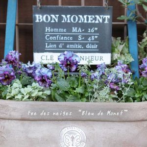 深く美しい青 クロード・モネが 『睡蓮』に描いた青 そんな色合いを目指して育種されているらしいフリルパンジー フェデネージュ・モネブルー 園芸店の棚には 滲むような淡い水色や濃い紫… それぞれの美しいモネブルーが並んでいた そこから悩みに悩んで… 色合いを揃えた3株をお連れした リーフ類は、主張せず ブルーを引き立たせるシルバー系の ロータスクレティクス ラミウムスターリングシルバー シルバーレモンタイム を添える程度に… そこに ジヴェルニーの庭 の景色を想って… (ღ*ˇᴗˇ*)。✧*。