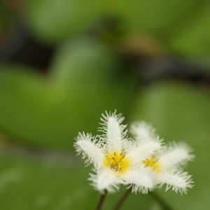 ガガブタ🌿 (鏡蓋) 白い花弁に 小さな毛がびっしりと… モフモフの感じが 可愛く 思わず触りたくなる 水草です🫧🎶 *ミツガシワ科 *アサザ属