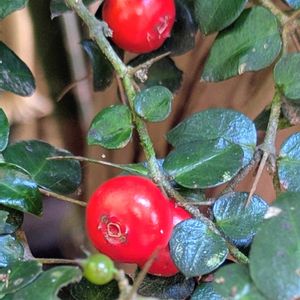 今日2枚目は早くも色付いてた アリドオシ🌿🔴🌿 アカネ科アリドオシ属🌿 ①9月に熟す直径5~6㎜の 実が既に真っ赤に🔴 ②葉っばは対生し大形と小形が交互に🌿大形の葉は長さ1.5~2㎝、幅7~20㎜の広卵形~広惰円形🌿葉質は硬く光沢があり側脈は2~3(4)対 ③和名の由来の蟻を刺し通すほど鋭い刺の長さは1~2㎝🪡 ④9月に赤く熟した実が翌春5月まで残り花と同時に見られる事もあります🔴🤍🔴 ⑤この子は多分ヒメアリドオシ お花は枝先に1~2個付き花冠は白で筒部の長さ7~9㎜、先が4裂します🤍 裂片は長さ2.5~5㎜の三角形▽ 🏷️金曜日の蕾たち 🏷️赤い実 🏷️山野草マニア ①②③さっき大山で🏕️ ④大山で5月に🏕️ ⑤牧野植物園で🏞️2025.5.18