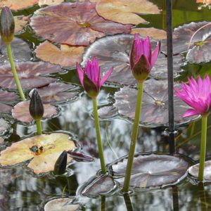 熱帯性スイレン。 日中花を開き、夜になると花を閉じることから、「睡眠をとる蓮(はす)」ということからスイレンと呼ばれるようになったそうですよ。初めて知りました。 温帯性スイレンは5月頃より咲き、熱帯性スイレンは7月頃から咲くそうです。 2枚目は、オオオニバスの蕾と葉。