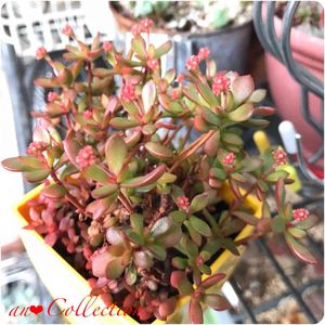 2020-1/9 🌕3.5℃/73%🌡ベランダ軒下🕡am 才ノヽ∋―_φ(゚▽゚*)♪ 寒ッpq('д'lll)三(lll'д')pq寒ッ思たら チラ雪❄️舞ってるやん😶寒いハズだ(*○*)!! 植え替えもせんと買ったポットまんのベランダ組 ガン見したら🏵咲いてた コレ、お花よな⁉️ ☄️ クラッスラ属・紅稚児(べにちご)☄️