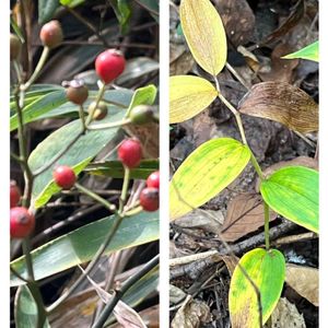 左※バラ科バラ属 北海道から九州に分布するツル性落葉低木 花期 4〜6月 円錐花序の白い花をつける 果期 9〜10月 球形で固い果実が結実し赤く熟して目立つ(正確には擬果) ♢萼筒が肥大したもので先端に萼片が残る(擬果) リースにも良く使われます 右※イヌサフラン科チゴユリ属 日本全土に分布する 花期 4〜6月 茎の先端に1cmほどの白い花を一つ咲かせる 花後には緑色から黒色の液果をつけるのですが落ちてしまったようです 種子繁殖の他にも地下茎により無性繁殖するようで「擬似一年草」と呼ぶようです 気になる方は検索してみてください