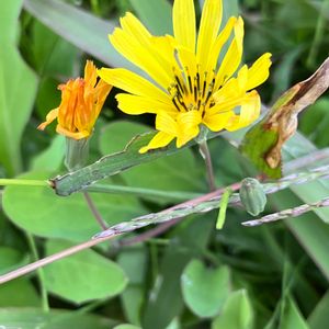10月23日撮影 イワニガナとジシバリどちらの名前が出てきます 本当はどちらの名前なのでしょうか? ※キク科ニガナ属 日本全土の日当たりの良いところに生える 細長い茎が地面をはい根をおろして増える 葉は薄く長い葉柄がある 葉身は卵円形から広卵形 花期 4〜6月となっていますがずっと咲いているのでしょうか? 黄色の頭花を1〜3個つける 総苞は円柱形、内片はI列上に並び外片は小さい