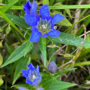 雪竜胆の素敵なお名前でも投稿させていただきます ※リンドウ科リンドウ属 別名 イヤミグサ(疫病草 古名はえやみぐさ) 本州から九州山野に生える 葉は対生、卵状披針形、先は長く尖る 花期 9〜11月 花冠は紫色⁈青にしか見えないですね😅 花びらに白い斑点があるので“雪竜胆”素敵なお名前ですね ♦︎園芸種ではなく自生のリンドウです 10月23日撮影