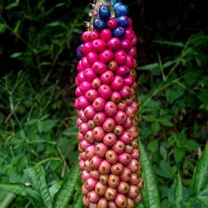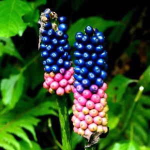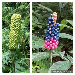 ヤマコンニャク 果実が緑、赤、青紫色と変化します。