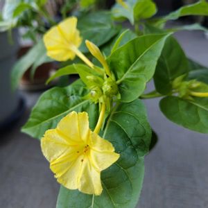 今朝の気温5℃ 最高気温は17℃くらいです🤠 まだ頑張って咲いているオシロイバナ🟡🟡🟡🔴 かなり冷えてきました💦💦 今朝、まだ咲いているオシロイバナを数えたら、この4個でした😅 一気に少なくなりました🤣 なぜか黄色がほとんどです😊 赤は半開きでした😌 蕾の付かないものから片付けています☘️🌱