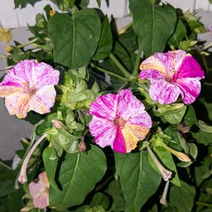 連続投稿失礼します 昨夜懐中電灯携えて オシロイバナ📸に出かけました 🔦を安定させる事が難しく、全体像がよく分からないまま、ストロボをたいて撮りました。 3色が沢山見られて感激です😍 種も少し出来ています😉