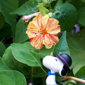 ~🌱オシロイバナ🌱~ 花言葉 💛いつも元気(黄色) 💛庭に…初の一輪 🏷️毎月2日はスヌーピーの日 眺めて…😍2ショット…🙌 🏷️チームスヌー 会員番号 No.15 ふじです 🏷️種から育てる♡ 🏷️オシロイバナ2025 初咲きは 💛絞り咲き~夕方5時 🏷️オシロイバナ愛好家友の会 昨年 花友さんから届いた 種~●●今年も庭で~🎶 🏷️繋がりに感謝✨ 🏷️一期一会のお花♡ 参加しま~す