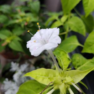8/15に挿し芽をした、純白のオシロイバナ白が、開花⚪⚪ 挿し芽から約二ヶ月🌿 一足先に赤が咲きましたが、目的だった純白も咲きました🎉🎊 今年、白は咲いていても、3色株からの白なので、純白もほしいかなと試みました😅 シーズンの途中からは、種より、挿し芽の方が確実で、早く咲きそうです🌼